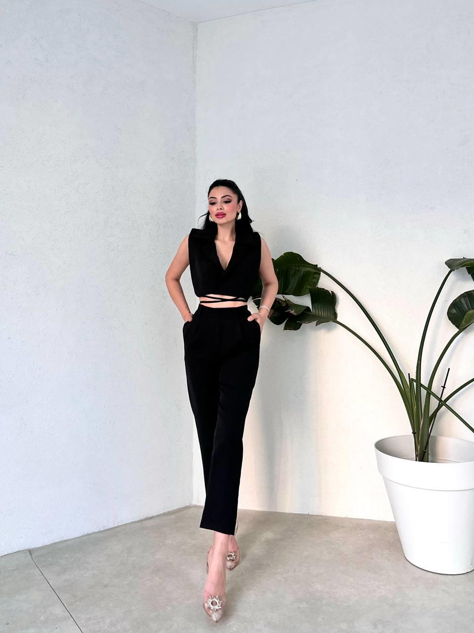 Bağlama Detaylı Tasarım Elbise Siyah Pantolon Yelek Takım
