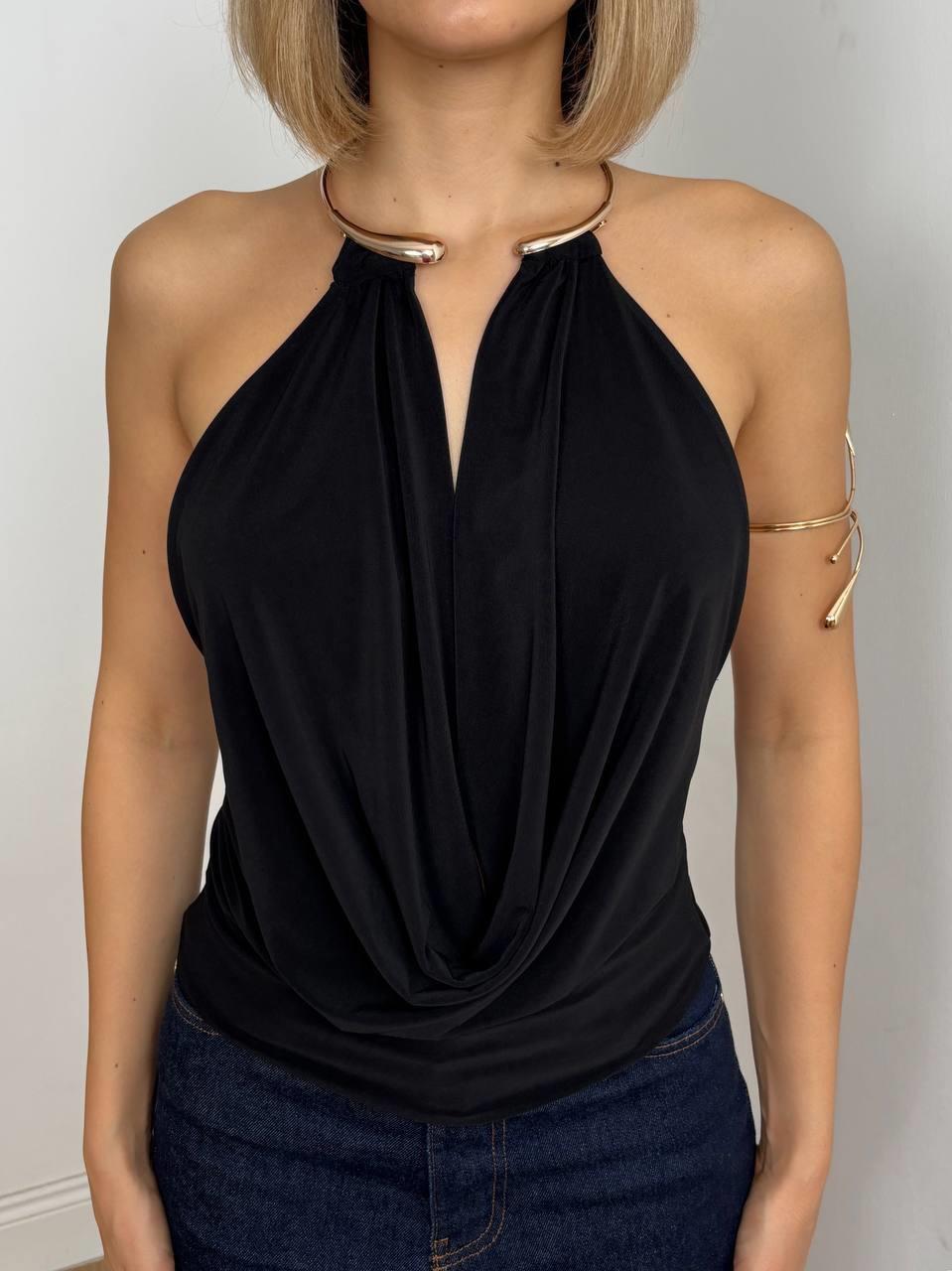 Kadın Abiye Sırt Dekolteli Boyundan Geçmeli Halka Aksesuarlı Bluz Tam Kalıptır.