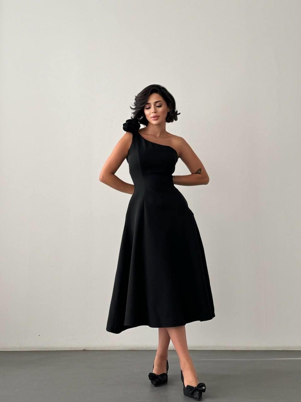 Kadın Abiye Tek Omuz Gül Detaylı Kloş Etekli Midi Elbise - Abiye & Mezuniyet Elbisesi